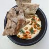 Hummus de garbanzo con aceite especiado, pimentón molido, garbanzos fritos y eneldo, acompañado de pan de pizzza